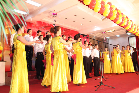 團拜會的最后,公司員工一起合演《歌唱祖國》,喜慶的表演,整齊的著裝,人浪涌動,煙花閃爍,把整個活動推向了高潮。
