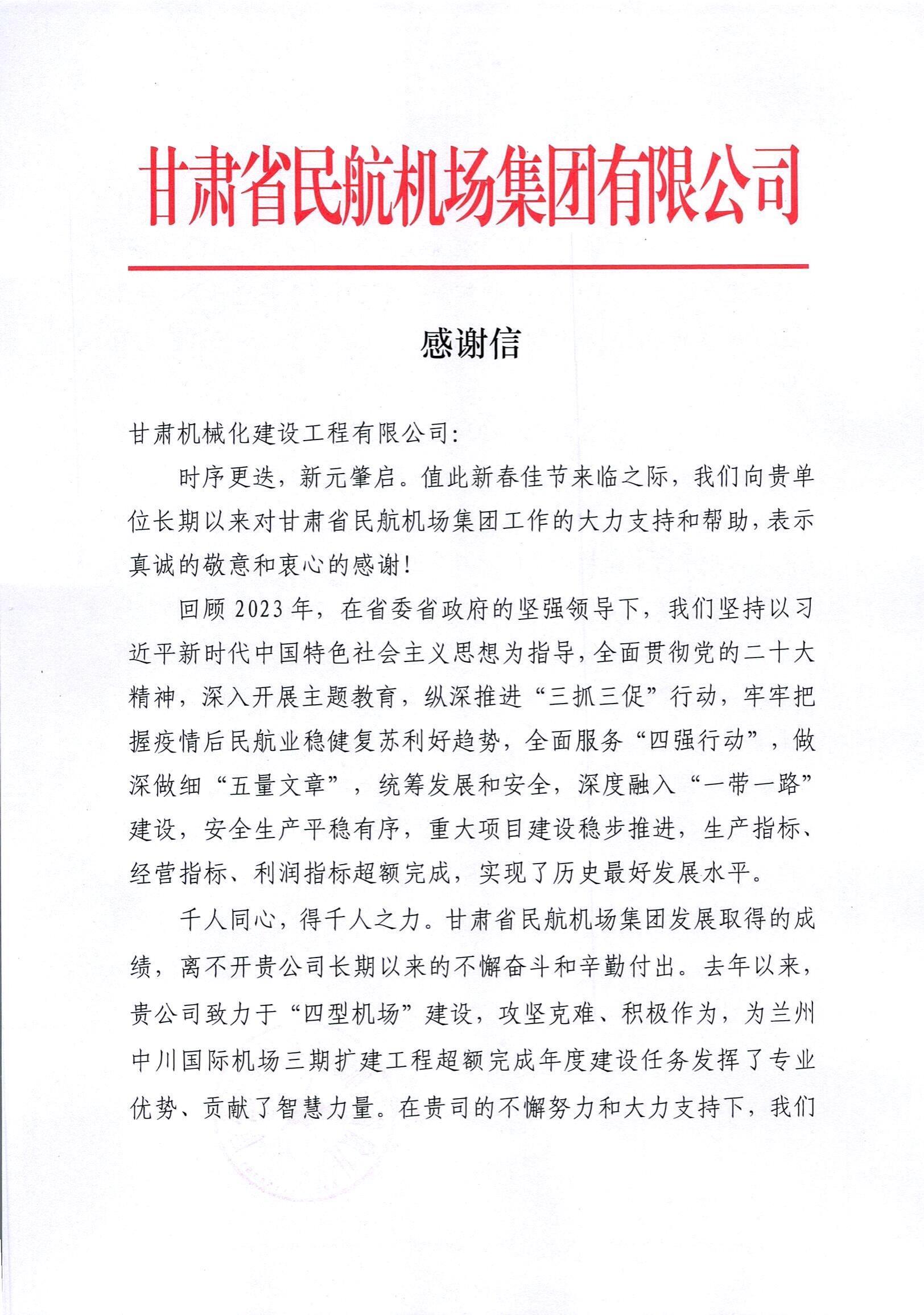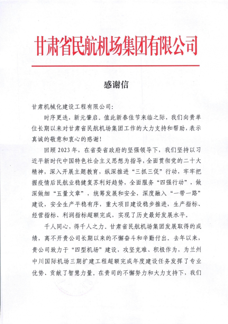 2月8日,新春佳節(jié)來臨之際,我司收到來自甘肅省民航機場集團有限公司的感謝信。